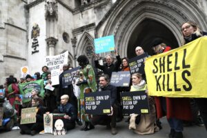 © M-A Ventoura/Amnesty International UK. Activists and speakers call for an end to Shell’s pollution of the Niger Delta and compensation outside the Royal Courts of Justice in London, on day one of the Ogale and Bille communities vs Shell trial, 13 February 2025.